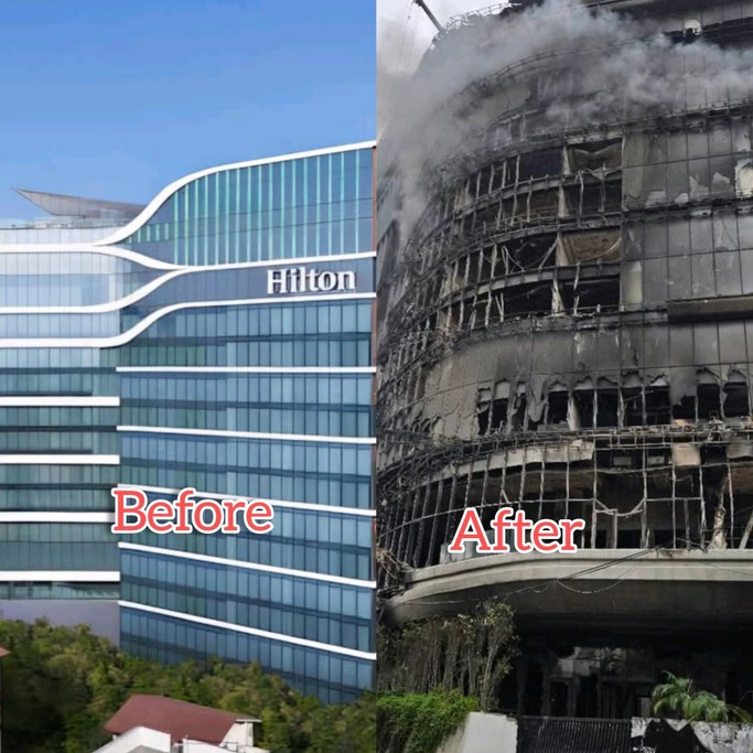 Foto’s van het verbranden van winkels, auto’s, het paleis enz.