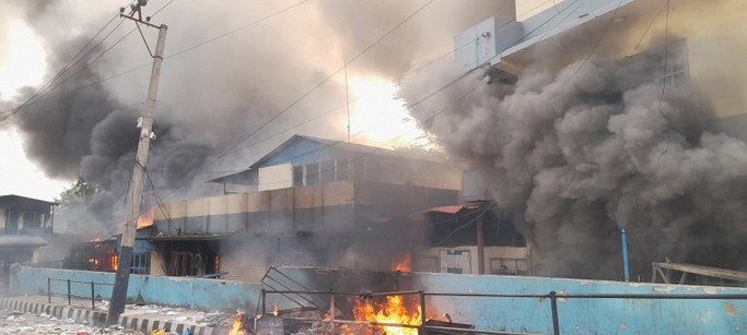 Foto’s van het verbranden van winkels, auto’s, het paleis enz.